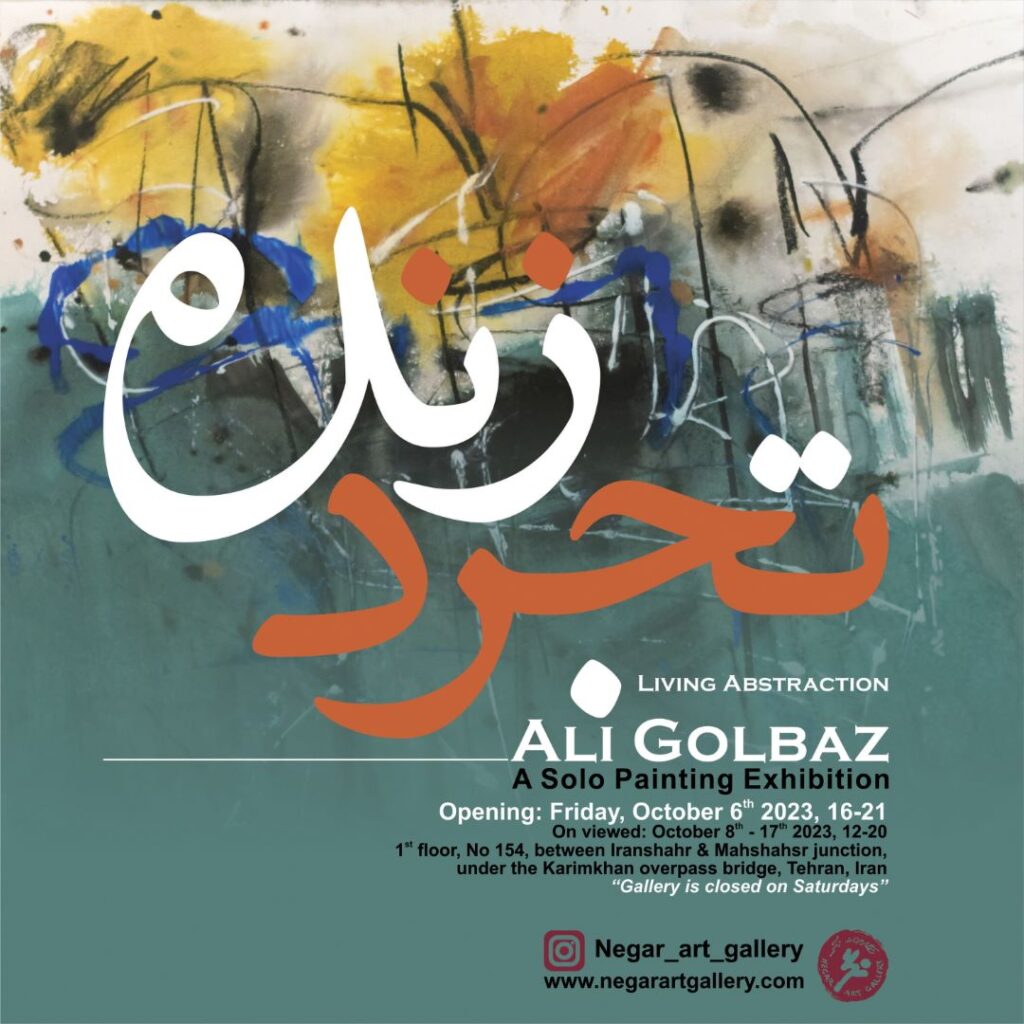 مبدأ این حرکت برای نقاشان مختلف، متفاوت است و همین تفاوت، ویژگیها و شاخصههای آثار تجریدی را تعیین میکند. روند نقاشانه علی گلباز از طبیعت بیجان آغاز شده و به نقطه مطلوبی در میان بازنمایی، بیان و انتزاع رسیده است. جایی که سطح رنگی و خطوط با رهایی از ساختار طبیعت و فرم اشیاء در خدمت بیان عاطفی نقاش قرار میگیرد.