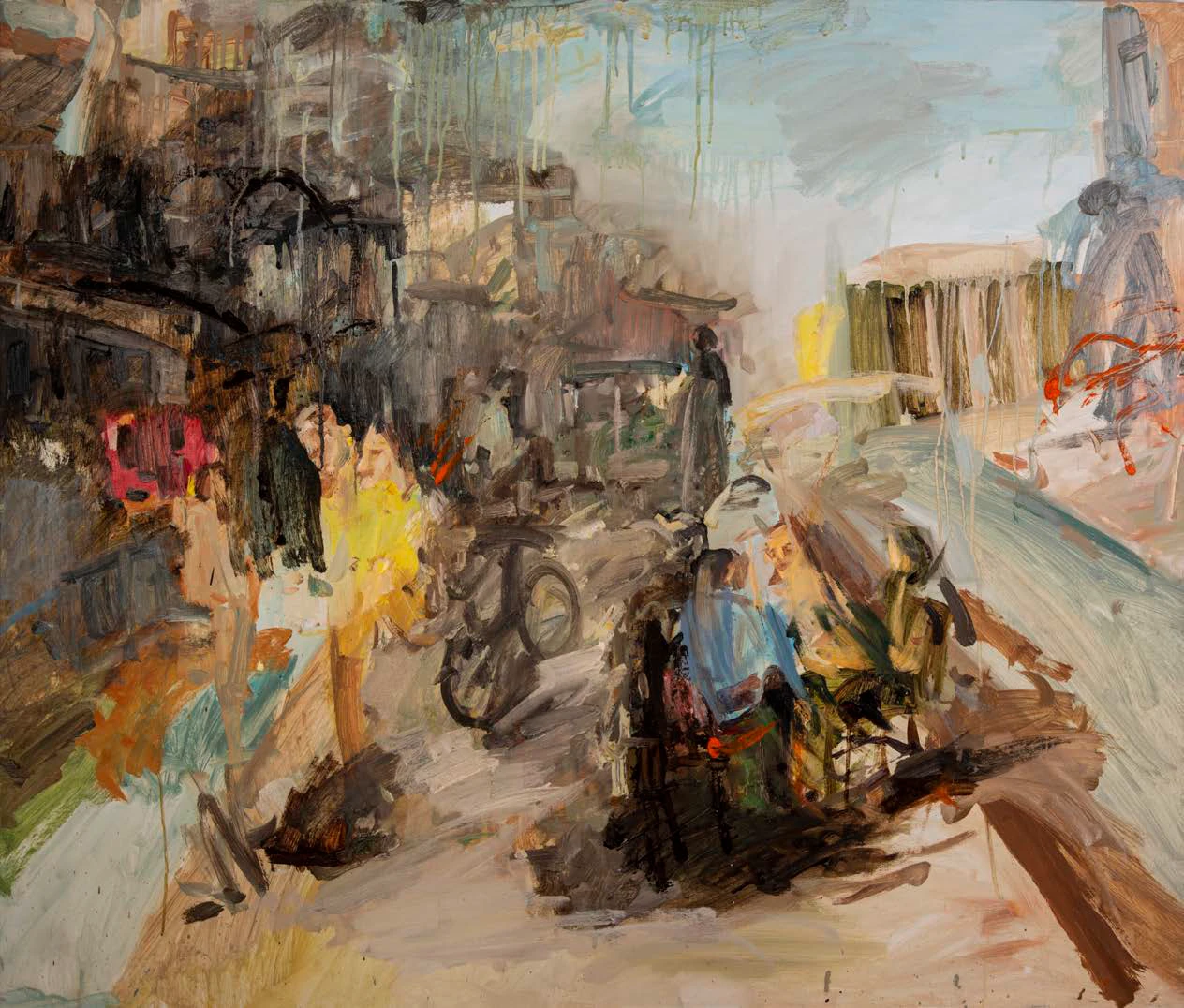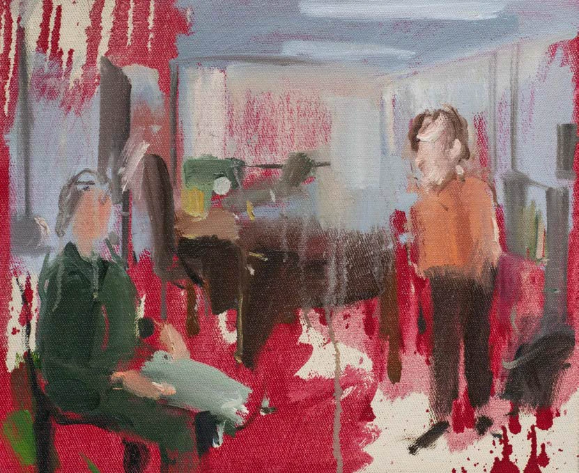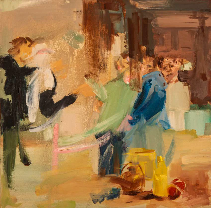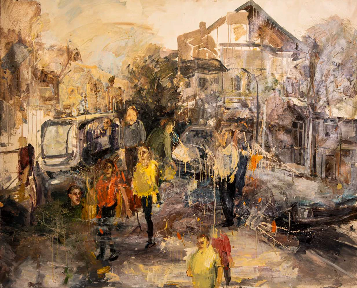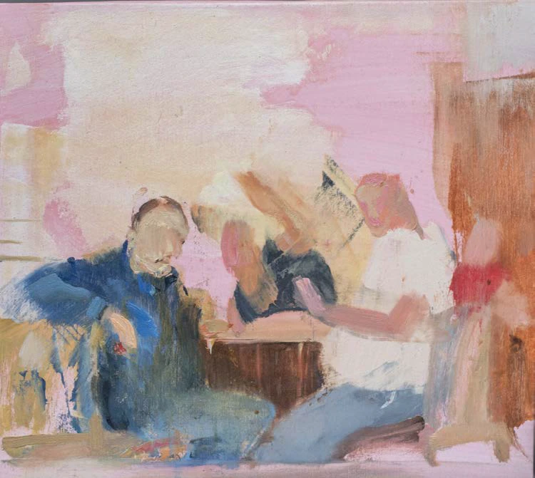 در منطقه خاکستری صلح و جنگ بی معناست، اینجا مکان بی طرف است، مکان مشاهده و عبور. چهره ها در مه زرینی فرو می روند و فضا در اعوجاج واقعگرایی، ایستایی خود را از دست میدهد. حتی رنگها نیز گم و پیدا می شوند و حضور و غیابشان تردید نقاش را برای باور کردن آنچه می بیند نشان میدهد. او در گوشه ای می ایستد و قلم اش را می لغزاند میان دلبستگی یا فرار از میان آنچه پیش رویش قرار گرفته تا آن لحظه خوشی گذرا را در ابدیت رها کند.